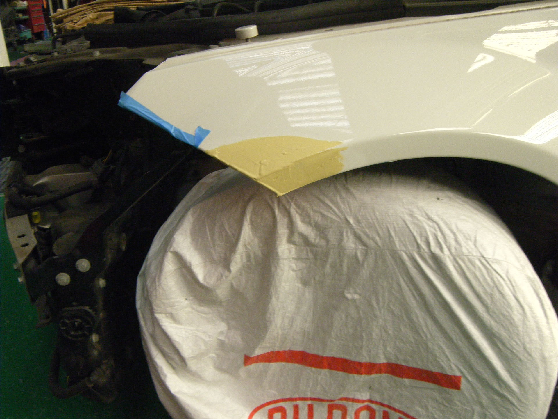 Fフェンダーの修理は新品のFバンパーを合わせながら板金を行っていきます。